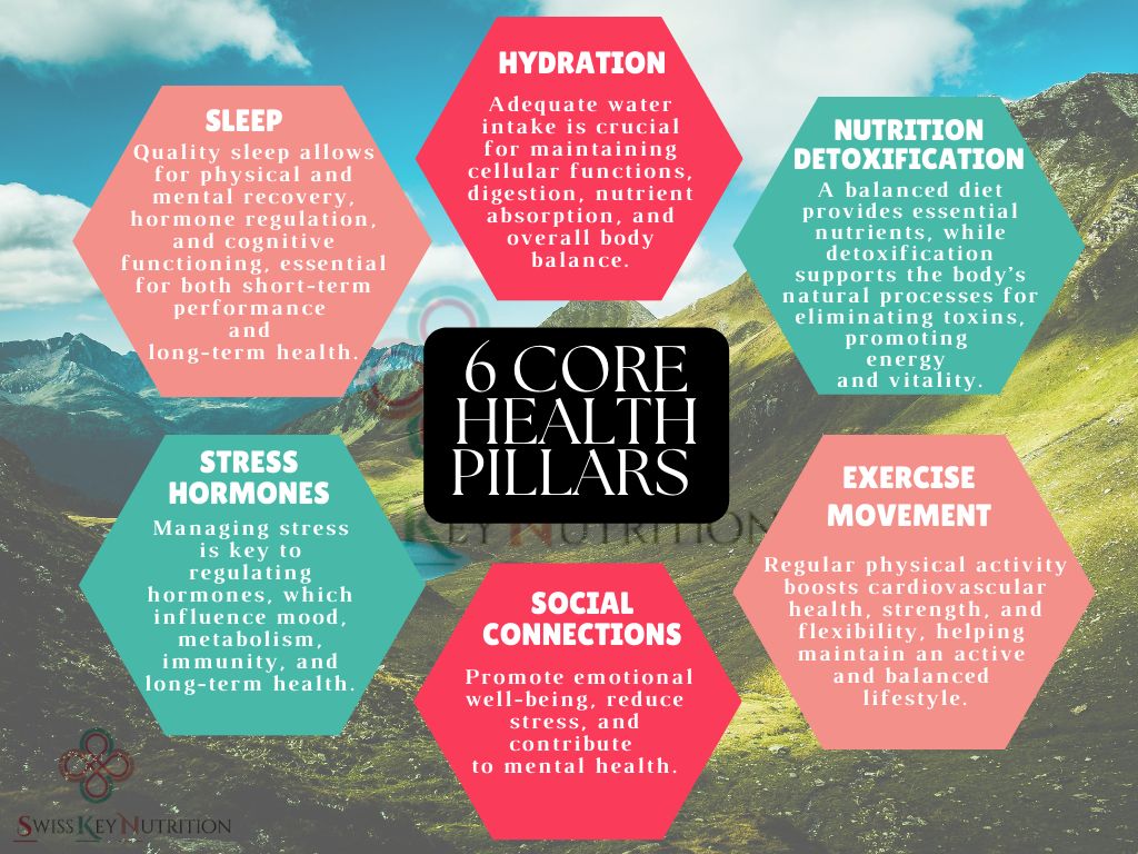 The 6 core health pillars: hydration, nutrition, sleep, stress, movement, and social connections, are deeply intertwined. The way we nourish and hydrate our body shapes hormone balance, enhances sleep quality, shields the brain from oxidative stress, and so much more. Together, these six key pillars form the foundation of truly balanced health.